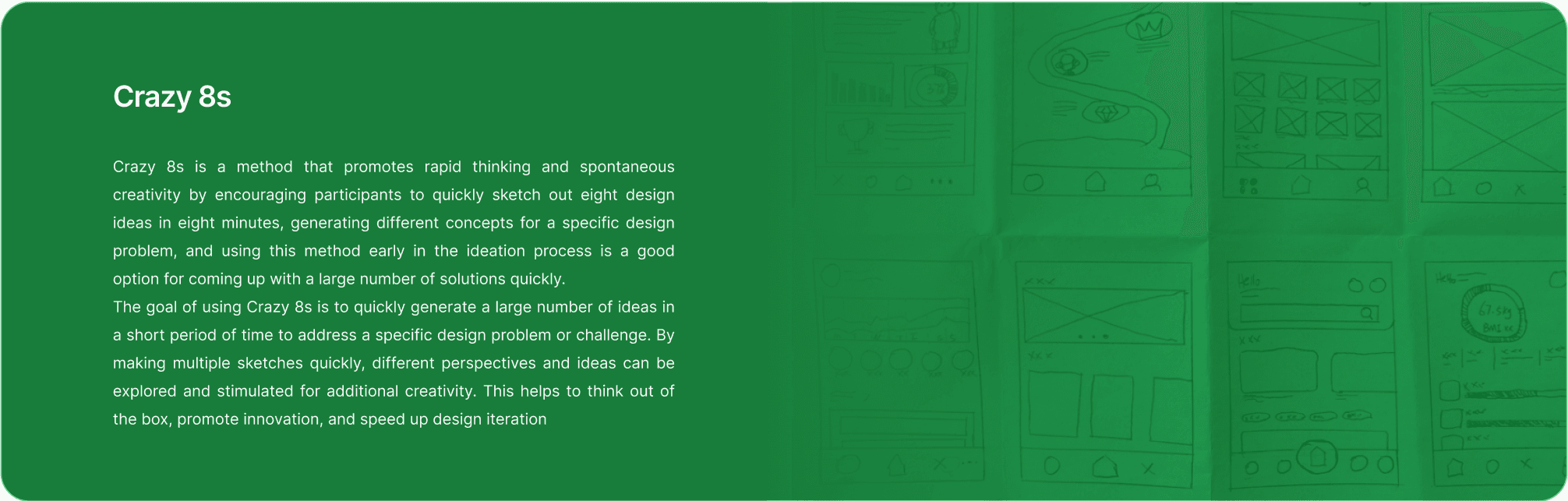 During the divergent thinking phase, Crazy 8s was able to generate a lot of ideas quickly, which helped us to think deeply and explore different design directions quickly.
