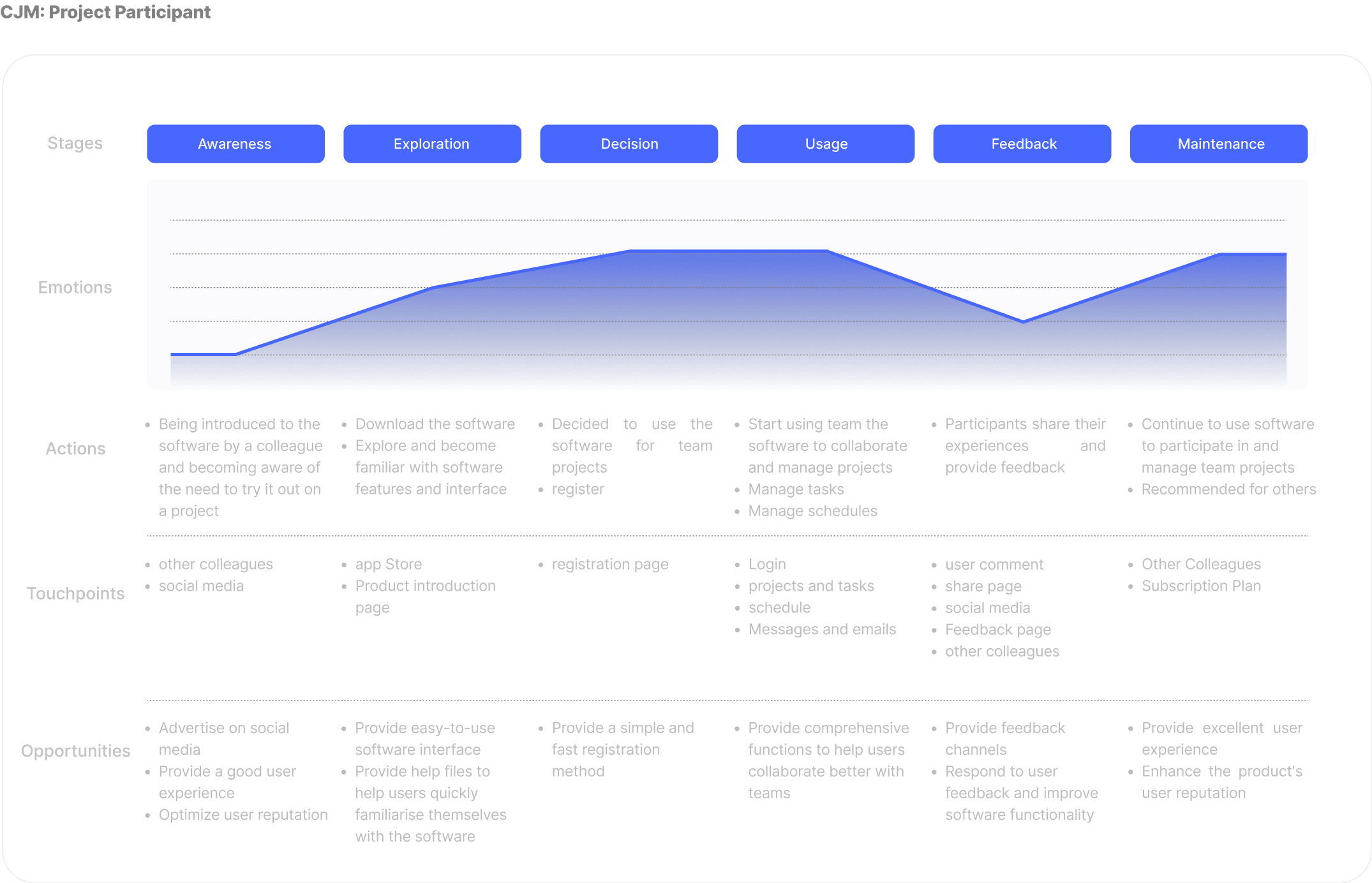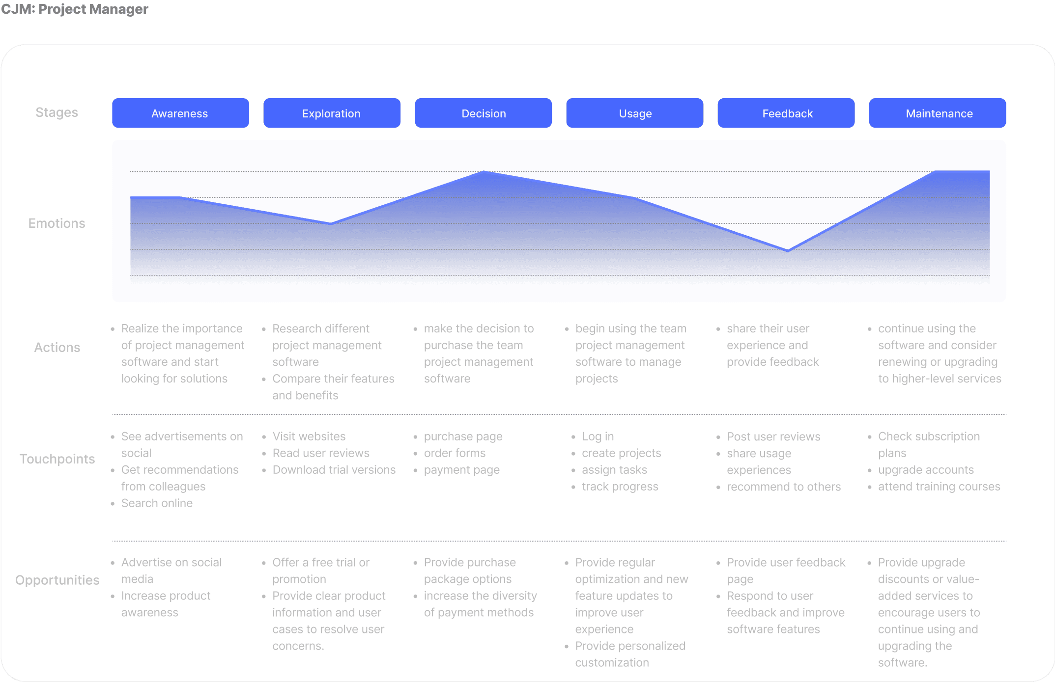 为例帮助我们全面理解用户的体验,识别和解决可能存在的问题,我们制作了Customer Journey Maps(CJM)。CJM是一种工具,用于可视化用户在与产品或服务互动过程中的体验。