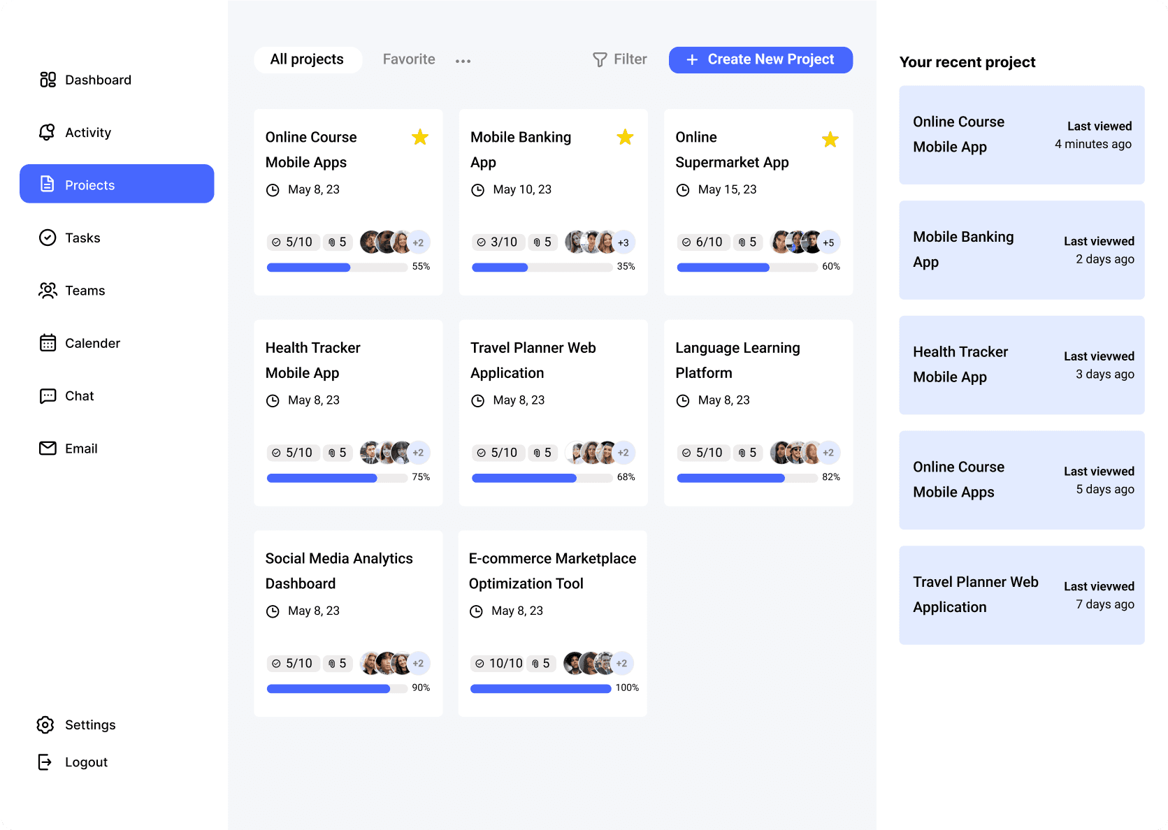 项目页面列出了用户参与的所有项目,并提供了详细的项目信息和管理功能。用户可以查看项目概况、参与成员、截止日期、任务列表、进度报告等信息,并进行项目的创建、收藏、编辑、删除等操作。此外,用户还可以在右侧快速访问最近的项目。