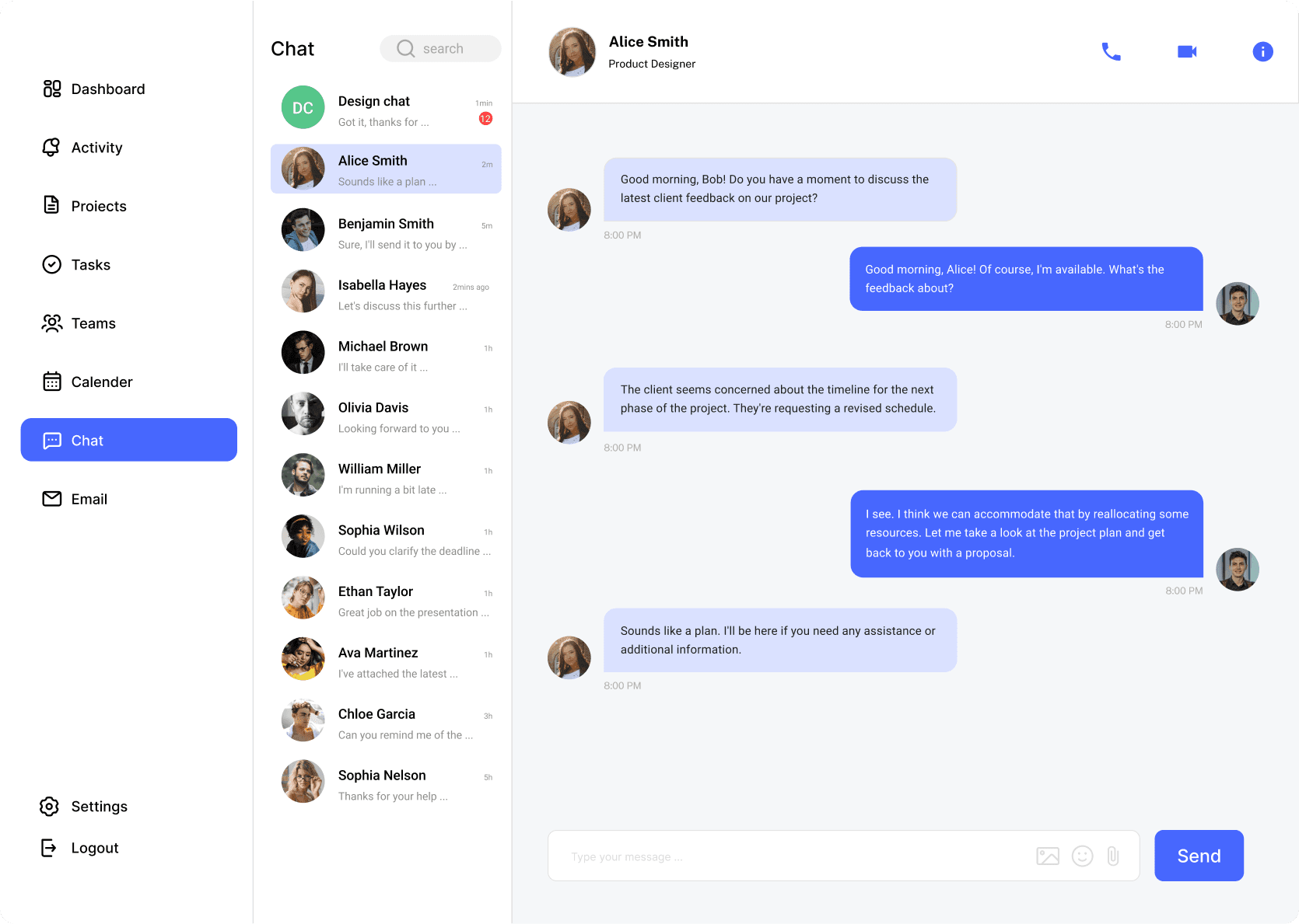 聊天页面提供了团队内部实时的一对一或多对多的即时交流功能,适用于需要快速交流、解决问题或讨论想法的场景。用户可以在这里进行语音、视频、文字、图片、文件等形式的即时交流和讨论。此外,用户还可以创建群组或私聊会话,方便与团队成员进行项目讨论和问题解决。