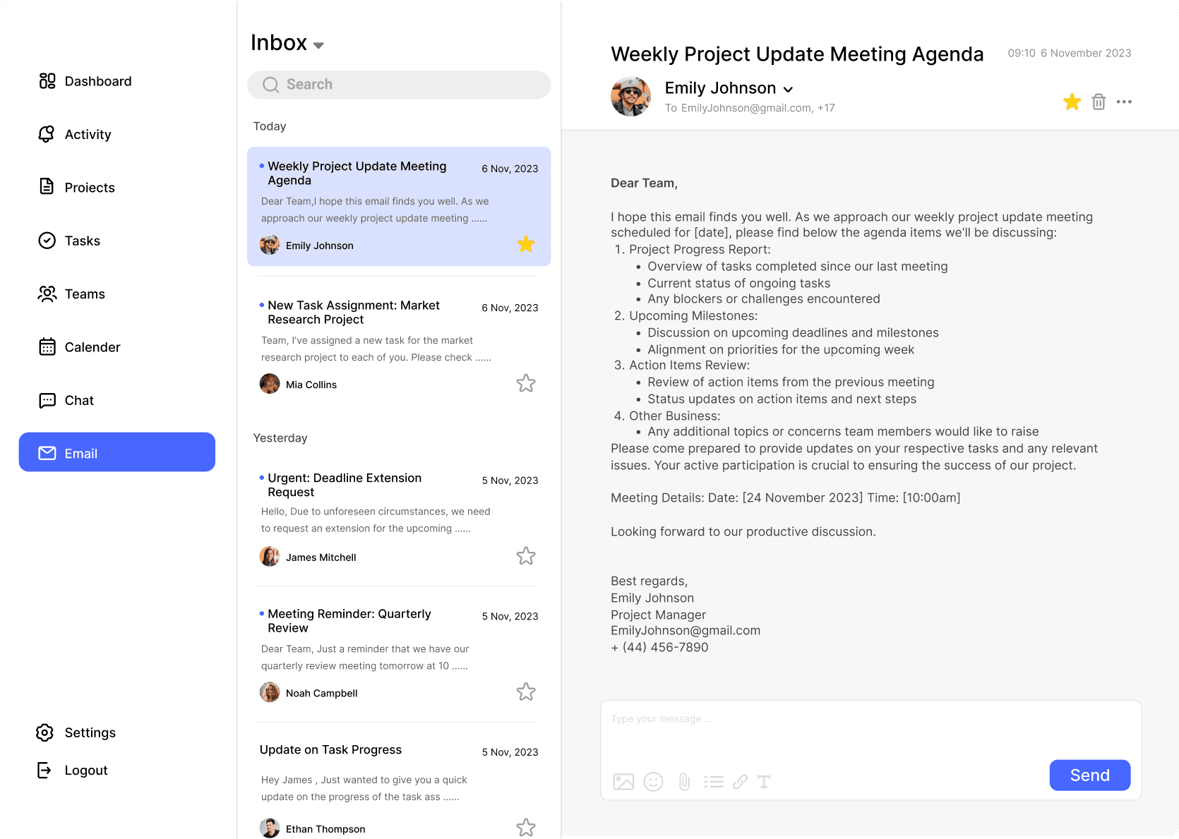 邮件页面为用户提供了一个集成的电子邮件功能,使其能够对团队内部的邮件进行收发和管理。适用于较为正式、长期性的沟通、通知或文件传递,也能够跨团队或跨部门进行更为深入的沟通和协作。