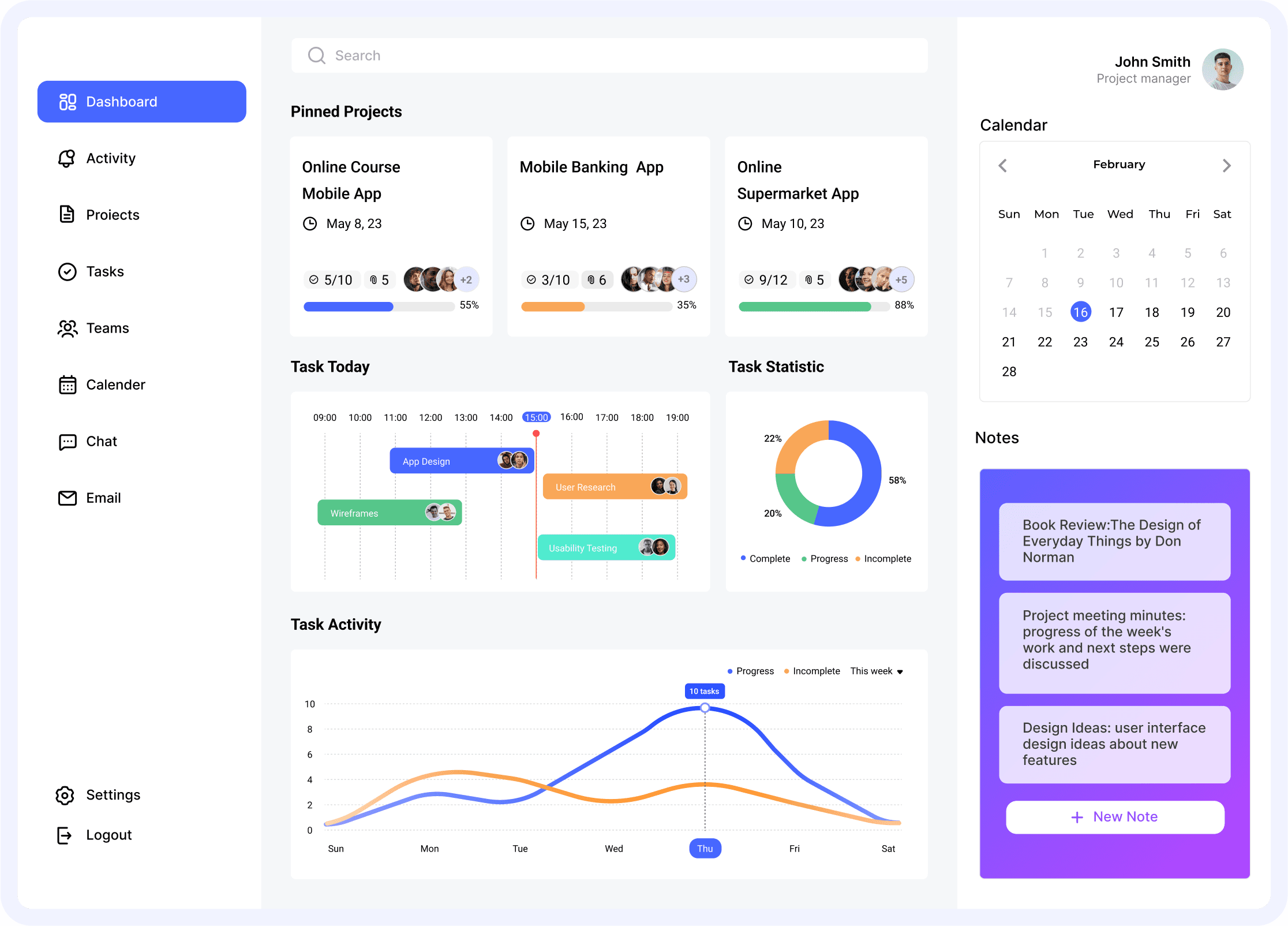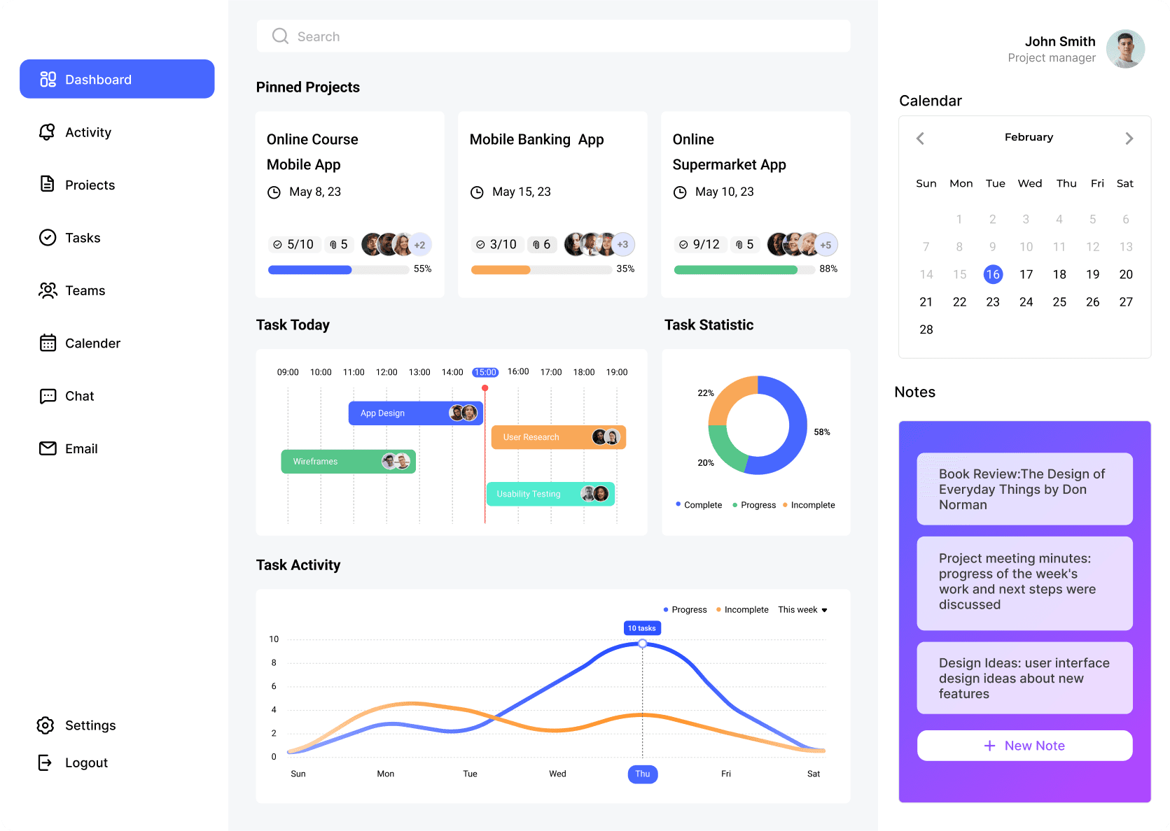 仪表盘是用户登录后首先看到的页面,提供了项目的总体概览和关键信息汇总。其中包括用户置顶的项目、当日任务、最近任务活动统计等重要数据的摘要信息,为用户快速了解团队工作情况提供便利。此外,在界面右侧提供了用户个人资料管理,以及常用小工具如日历、笔记、世界时间等,用户可以根据个人偏好进行自定义。