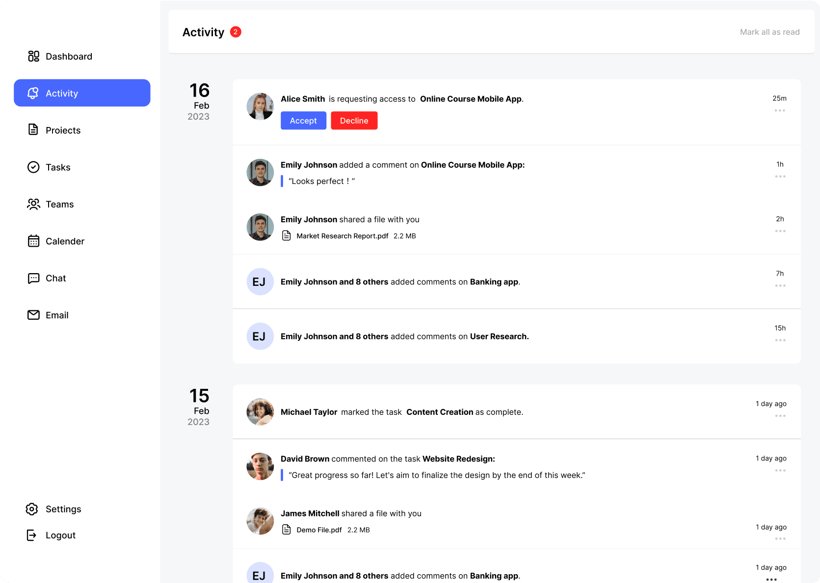 活动页面显示了用户参与项目的团队内各种活动和事件的实时更新。用户可以在此查看最新的项目动态、任务更新、团队成员的评论和讨论、以及团队成员的活动等内容,从而帮助他们保持对团队工作的实时了解和沟通。